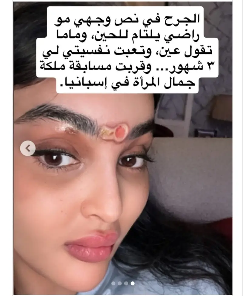 قبل ثلاثة أشهر، تعرضت لحادث أدى لجرح غائر بين حاجبيها لم يلتئم حتى الآن . ناشدت عبر إنستغرام: "الجراح ما زالت، وماما قالت عين" .