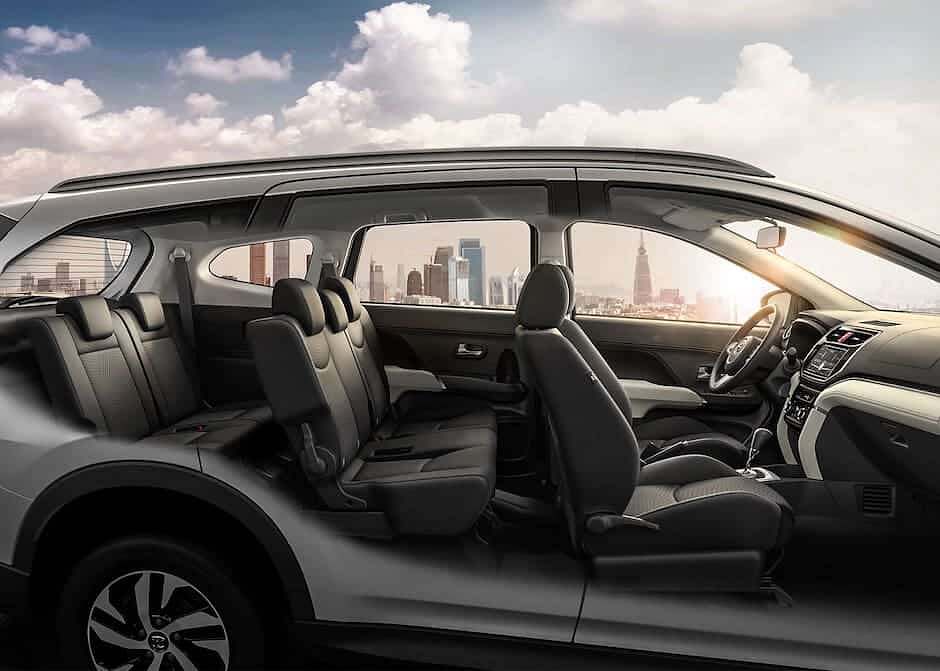 من الداخل، توفر تويوتا راش 2025 مقصورة رحبة تستوعب حتى 7 ركاب، مع إمكانية طي المقاعد الخلفية لتوسعة المساحة التخزينية. وتضم السيارة مكيف هواء أوتوماتيكي، وشاشة لمس قياس 7 بوصات تدعم تطبيقات Apple CarPlay وAndroid Auto، إضافة إلى نظام صوتي مكون من 6 سماعات، وعجلة قيادة متعددة الوظائف تتيح التحكم بالأوامر الصوتية.