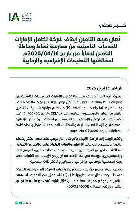 السعودية.. هيئة التأمين توقف شركة "تكافل الإمارات" عن ممارسة نشاط وساطة التأمين وتكشف عن الأسباب