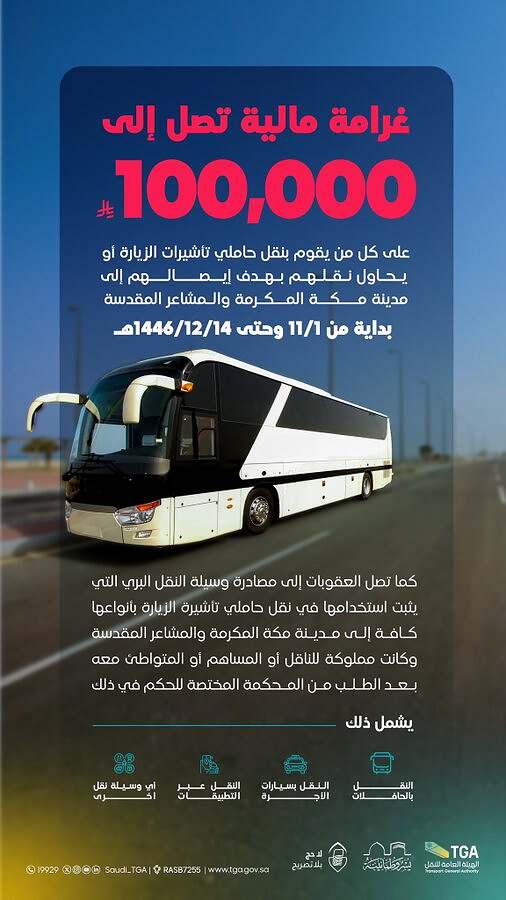 نقل الحجاج بدون تصريح يعرّضك لغرامة تصل إلى 100 ألف ريال.. تحذير رسمي من "النقل" السعودية