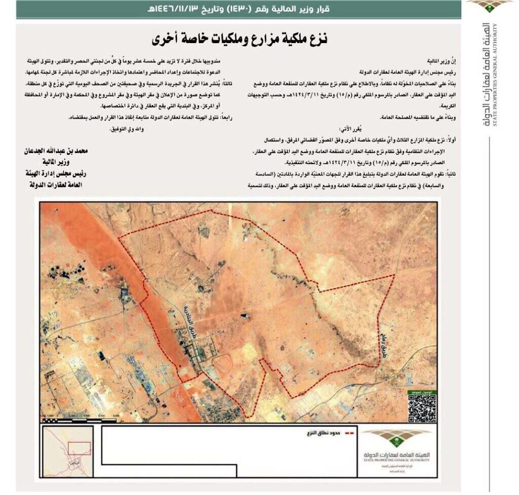 أصدر وزير المالية السعودي، ورئيس مجلس إدارة الهيئة العامة لعقارات الدولة، محمد بن عبدالله الجدعان، قرارًا رسميًا بنزع ملكية ثلاث مزارع وعدد من العقارات الخاصة في مدينة الرياض، تقع في المنطقة الواقعة بين طريقي الجنادرية ورماح، إلى الشرق من مطار الملك خالد الدولي.
