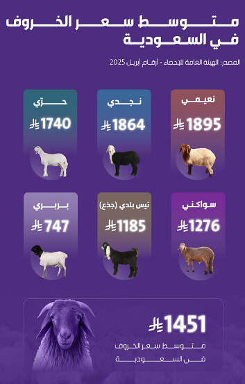 وبحسب البيانات الرسمية، بلغ متوسط سعر جميع أنواع الأغنام حوالي 1451 ريال سعودي، وتصدر الخروف النعيمي قائمة الأعلى سعراً بمتوسط 1895 ريالًا، يليه النجدي بـ1864 ريالًا، ثم الحري بـ1740 ريالًا.