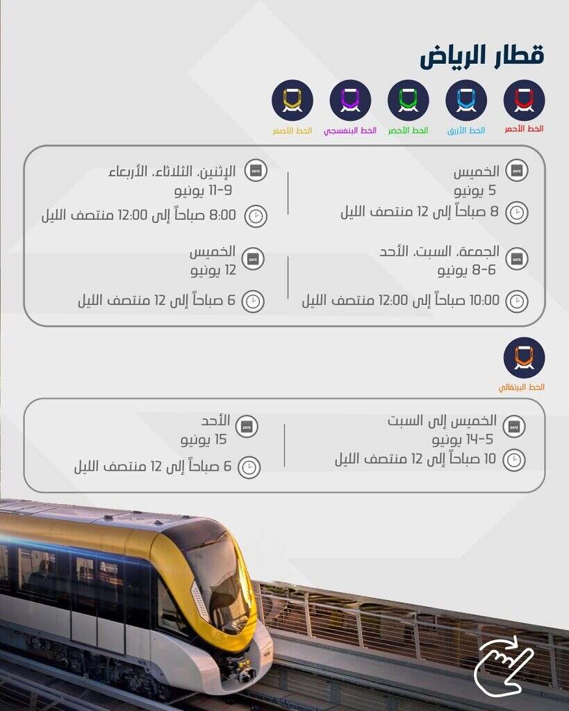 وذكرت الهيئة أن خدمة قطار الرياض ستنتهي يوميًا عند الساعة 12 بعد منتصف الليل طوال فترة العيد، مع تباين ساعات بدء التشغيل حسب المسارات حيث يبدأ المسار البرتقالي العمل في الفترة من 5 إلى 14 يونيو (9 إلى 18 ذو الحجة) عند الساعة 10 صباحًا، على أن تعود ساعات العمل المعتادة عند 6 صباحًا بدءًا من 15 يونيو.