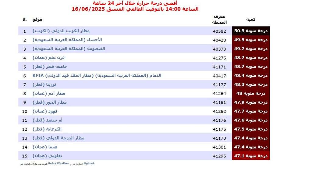 وهذه هي المرة الأولى هذا الصيف التي تحتل فيها مدن من دول الخليج المراكز الثلاثة الأولى في قائمة أعلى درجات الحرارة المسجلة عالميًا، وهو ما يعكس شدة الكتلة الهوائية الحارة المسيطرة على المنطقة.