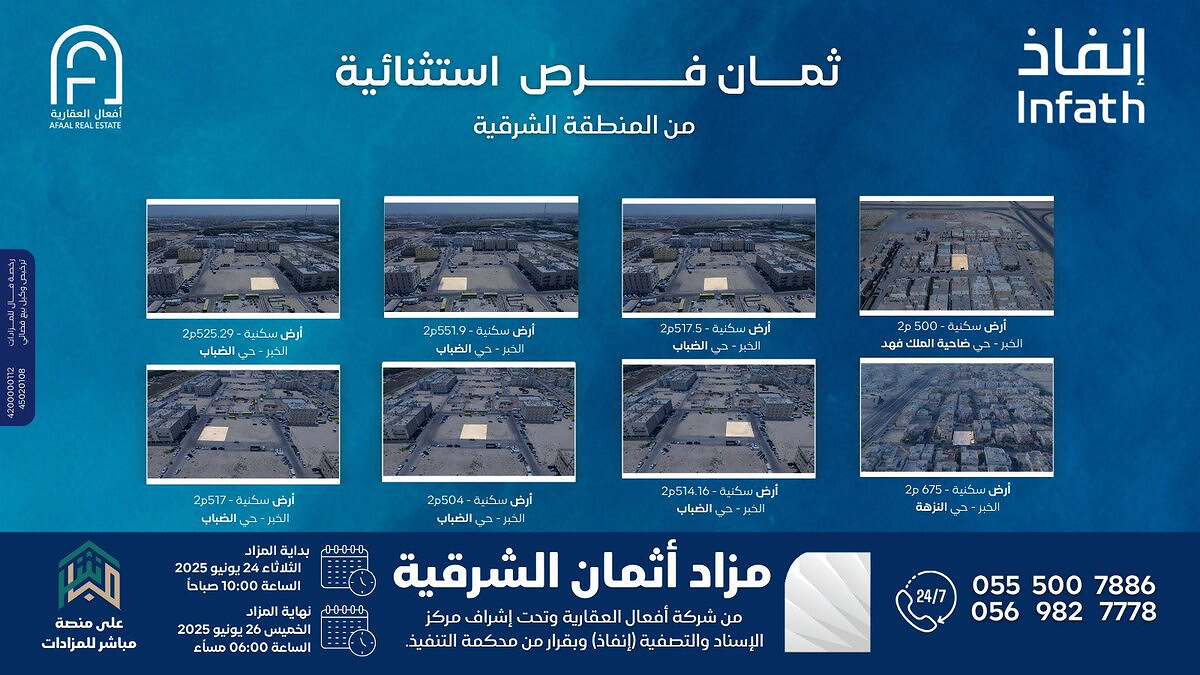 8 قطع أراضٍ سكنية ضمن مخطط الضباب بمدينة الدمام، وأرض في حي ضاحية الملك فهد (500 م²)، وأخرى في حي النزهة (675 م²).