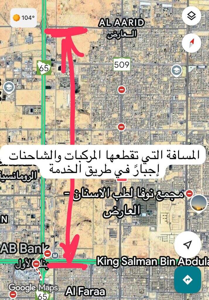 وأشار الأهالي إلى أن الإغلاق الحالي لـالفتحة الوحيدة التي تتيح الدخول إلى طريق الملك فهد الرئيس للقادمين من طريق الملك سلمان باتجاه الغرب، قد فرض على جميع المركبات – بما فيها الشاحنات – استخدام طريق الخدمة الممتد لأكثر من 8 كيلومترات، للوصول إلى أقرب نقطة دخول عبر جسر القوات الخاصة للطوارئ، مرورًا بأسفل جسر جامعة اليمامة.