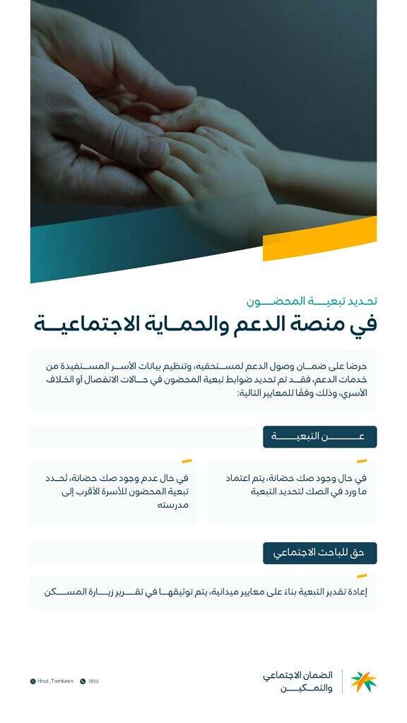 في إطار حرصها المستمر على تنظيم وتطوير خدمات الدعم الاجتماعي، أعلنت منصة "الضمان الاجتماعي والتمكين" عن اعتماد ضوابط جديدة واضحة لتحديد تبعية المحضون في حالات الانفصال أو الخلافات الأسرية، بهدف ضمان وصول الدعم لمستحقيه بدقة وعدالة.
