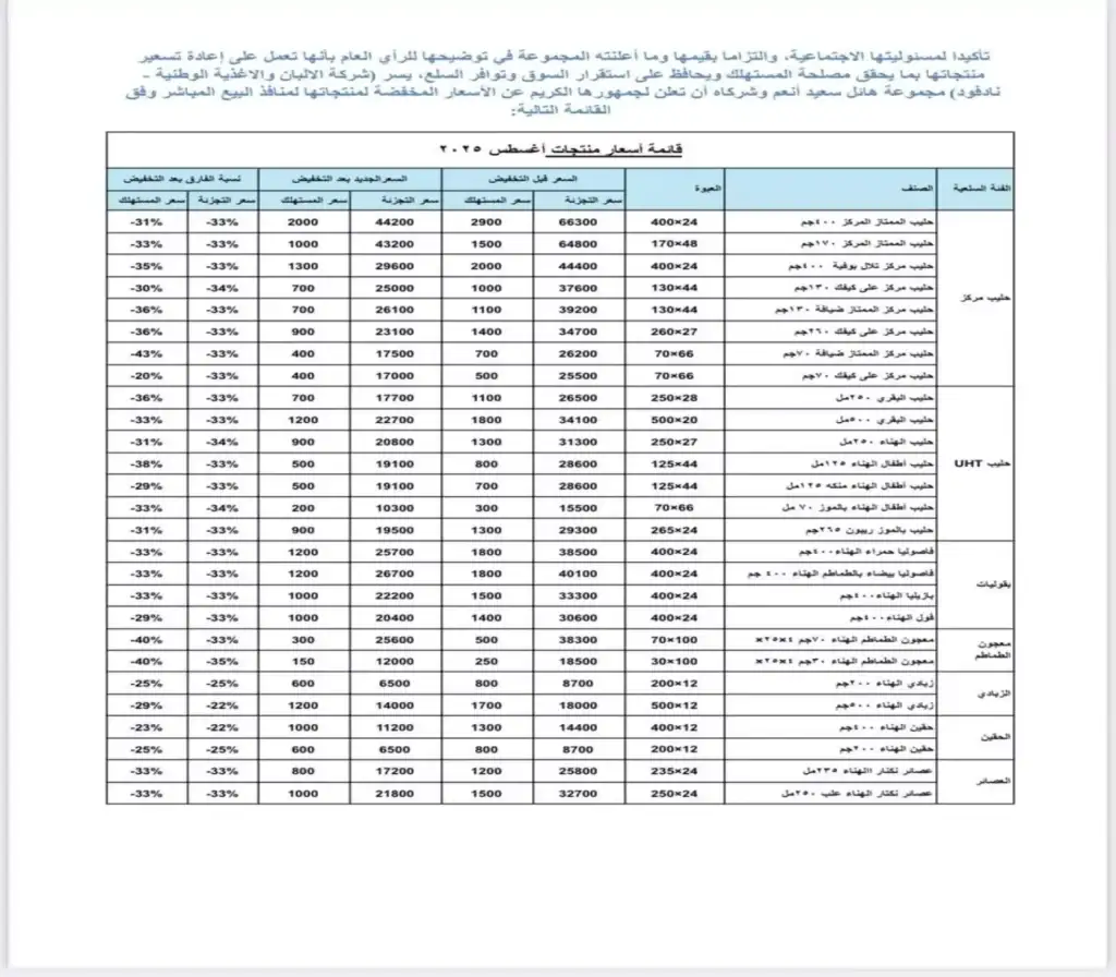 وبحسب بيان رسمي صادر عن المجموعة، فقد وصلت نسبة التخفيضات الجديدة إلى 35% على أغلب السلع الأساسية المنتجة محليًا، باستثناء منتجي الزبادي والحقين، حيث اقتصرت التخفيضات عليهما على 25% فقط، رغم كونهما من بين المنتجات الأكثر رواجًا وانتشارًا في السوق اليمني. ولم تُفصح المجموعة عن أسباب هذا الاستثناء، ما أثار تساؤلات بين المستهلكين والمراقبين الاقتصاديين.