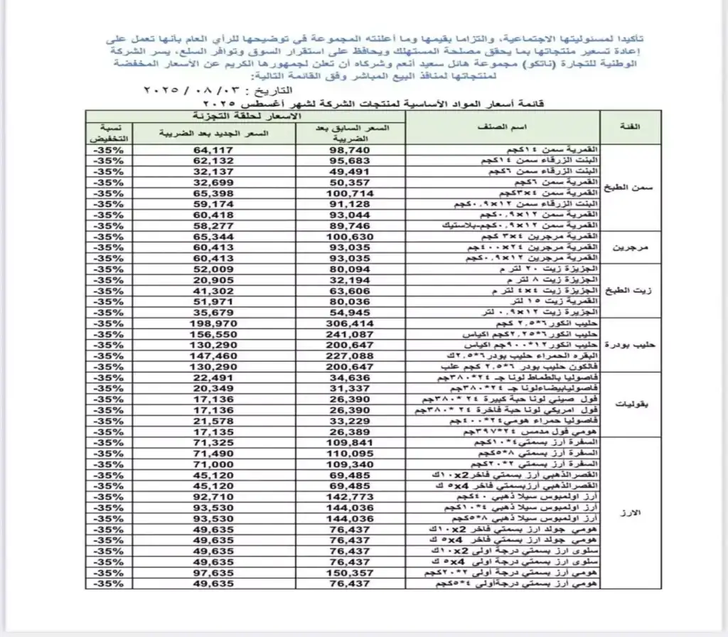 وفي هذا السياق، سبق للمجموعة أن أبدت قلقها من فرض تسعيرات "غير واقعية" قد تضر بالمنتجين والمستوردين، مطالبة الحكومة والبنك المركزي بـ"توفير العملة الصعبة بسعر السوق السائد"، لتفادي أزمة تموينية جديدة قد تمتد لجميع المصنعين وتجار الجملة والتجزئة، وتنعكس سلبًا على المستهلك النهائي.